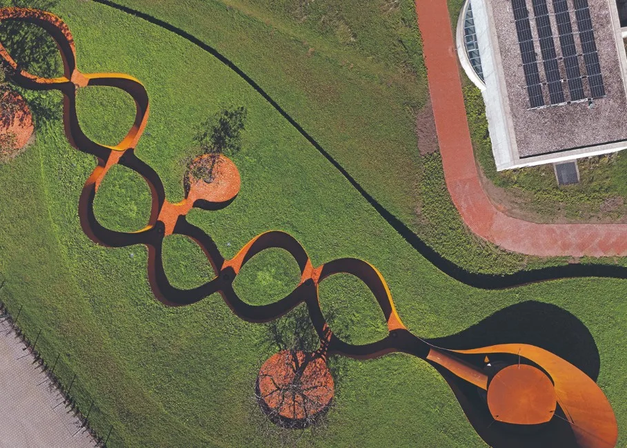 O Doshi Retreat, o mais recente projeto no campus da Vitra, é um espaço que convida à reflexão e à contemplação. Ao percorrermos o caminho sinuoso que leva a este retiro, somos envolvidos por uma atmosfera que nos desconecta do mundo exterior e nos aproxima de uma experiência sensorial única. O som suave de um gongo dá as boas-vindas aos visitantes, criando um ambiente propício para a introspeção.